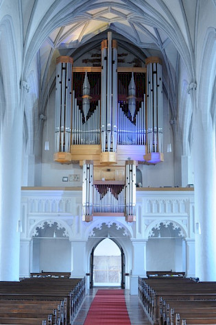Die erste Orgel wurde wohl bereits um das Jahr 1500 erbaut. Sie befand sich wahrscheinlich auf einer hölzernen Schwalbennest-Empore an der Westwand. Auch das Folgeinstrument aus dem 17. Jahrhundert wurde dort erbaut. Nachdem Mitte des 19. Jahrhunderts die neue Westempore eingebaut worden war, wurde das Instrument umgestellt und erweitert. 1907 wurde ein neues Instrument in einem neugotischen Gehäuse aufgestellt, das wiederum 1948 durch eine dreimanualige Orgel mit 45 Registern ersetzt wurde. Die heutige Orgel wurde 1997 durch die Firma Johannes Klais Orgelbau aus Bonn erbaut. Das Instrument umfasst insgesamt 44 Register auf drei Manualen und Pedal. Die Spieltrakturen sind mechanisch, die Registertrakturen elektrisch.